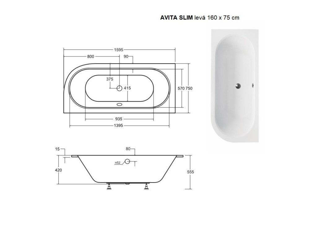 BESCO - Asymetrická vana AVITA SLIM - bez nožiček, 160 × 75 cm, levé