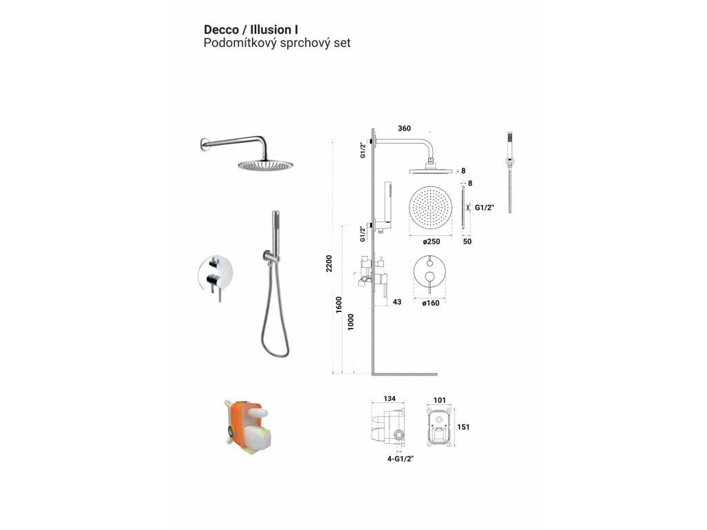 Součástí balení je podomítková baterie DECCO/ILLUSION I/VEO + podomítkový montážní box + ruční sprcha + sprchová hadice + vývod a držák ruční sprchy + hlavová sprcha s držákem.