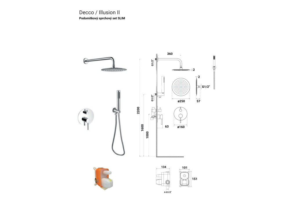 Součástí balení je podomítková baterie SLIM DECCO/ILLUSION II/VEO + podomítkový montážní box + ruční sprcha + sprchová hadice + vývod a držák ruční sprchy + hlavová sprcha s držákem.