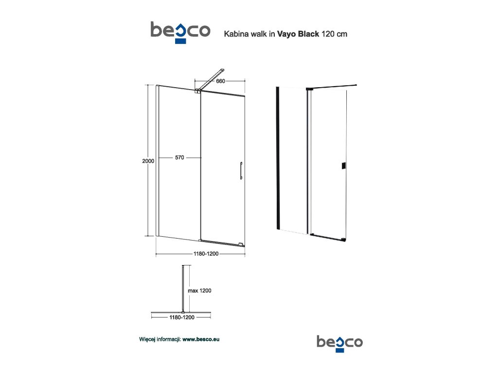 BESCO - Walk-in sprchový kout VAYO BLACK - Černá, Rozměr A - 120, Rozměr C - 200, zavírání univerzální levé / pravé, čiré bezpečnostní sklo - 8 mm