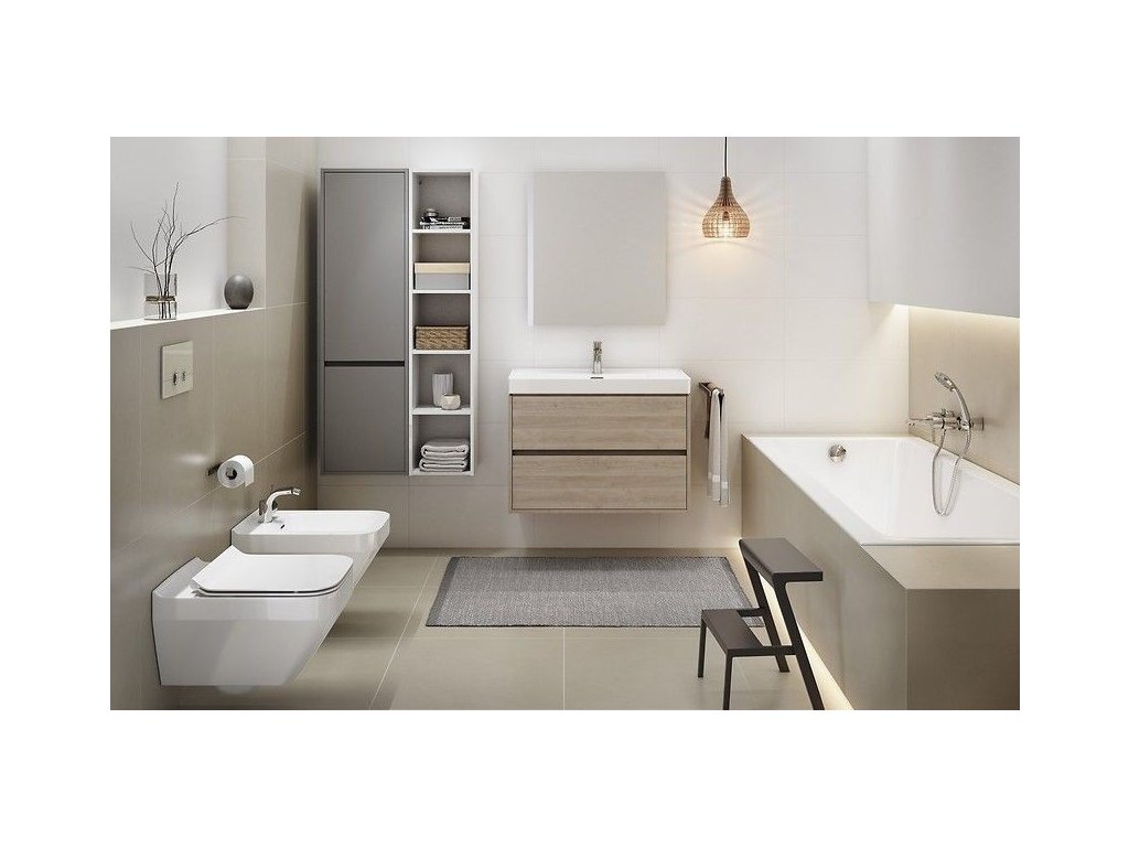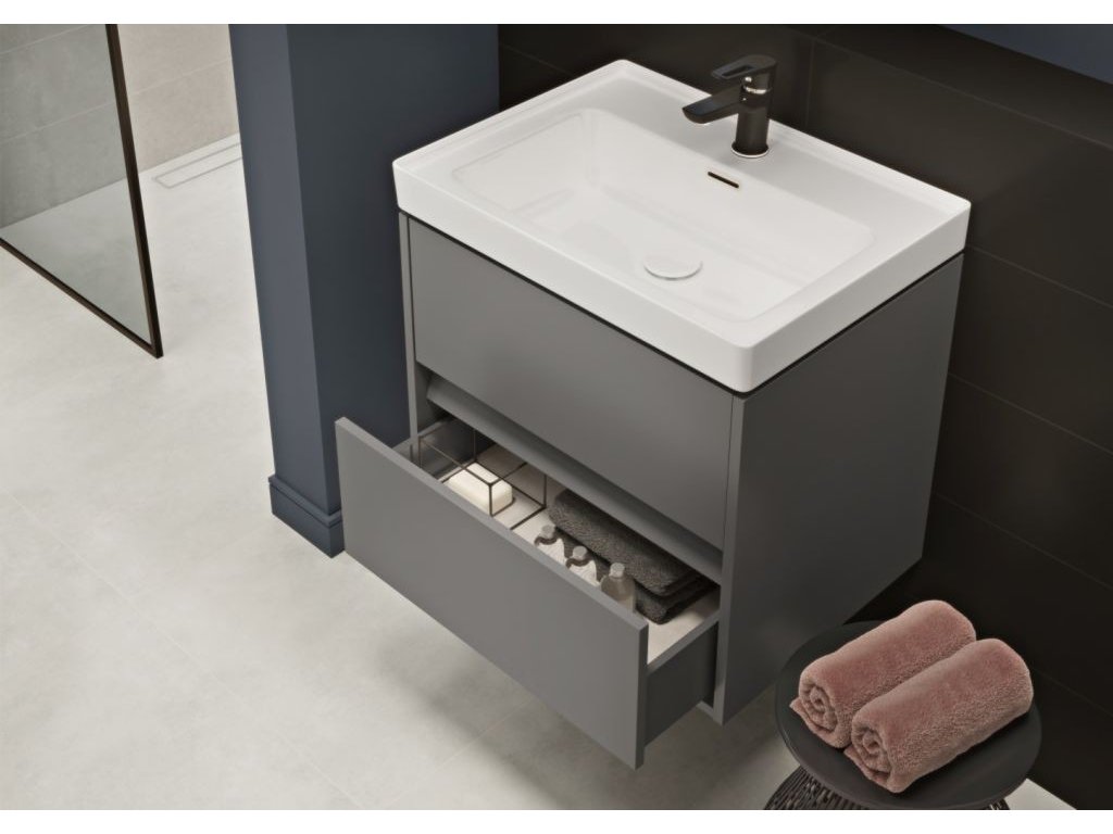 Součástí sestavy je závěsná umyvadlová skříňka CREA 80 s nábytkovým umyvadlem CREA 80. Čelo a korpus skříňky jsou vyrobeny z dřevotřísky odolné proti vlhkosti dub v barvě dubu. Skříňka je vybavena systémem dotykového otevírání (tzv. PUSH SYSTEM) a dvěma prostornými zásuvkami. Šedá struktura lnu dodává skříni další elegantní vzhled. Umyvadlo CREA je vyrobeno z keramické hmoty ROCKLITE, díky čemuž je překvapivě odolné, lehké a s extrémně tenkými stěnami.