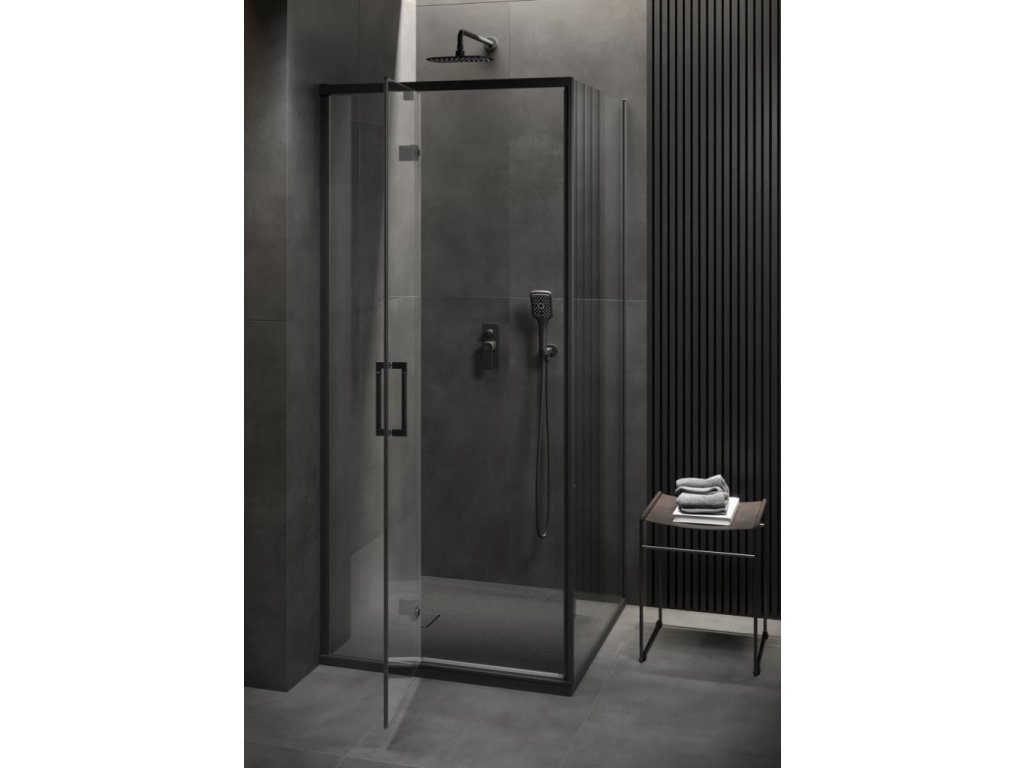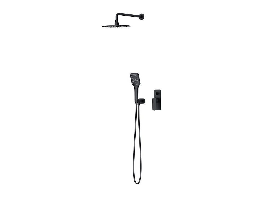 Podomítkový sprchový set z kolekce LARGA v černém provedení obsahuje hlavovou sprchu s uchycením do stěny, ruční sprchu a hadici.
