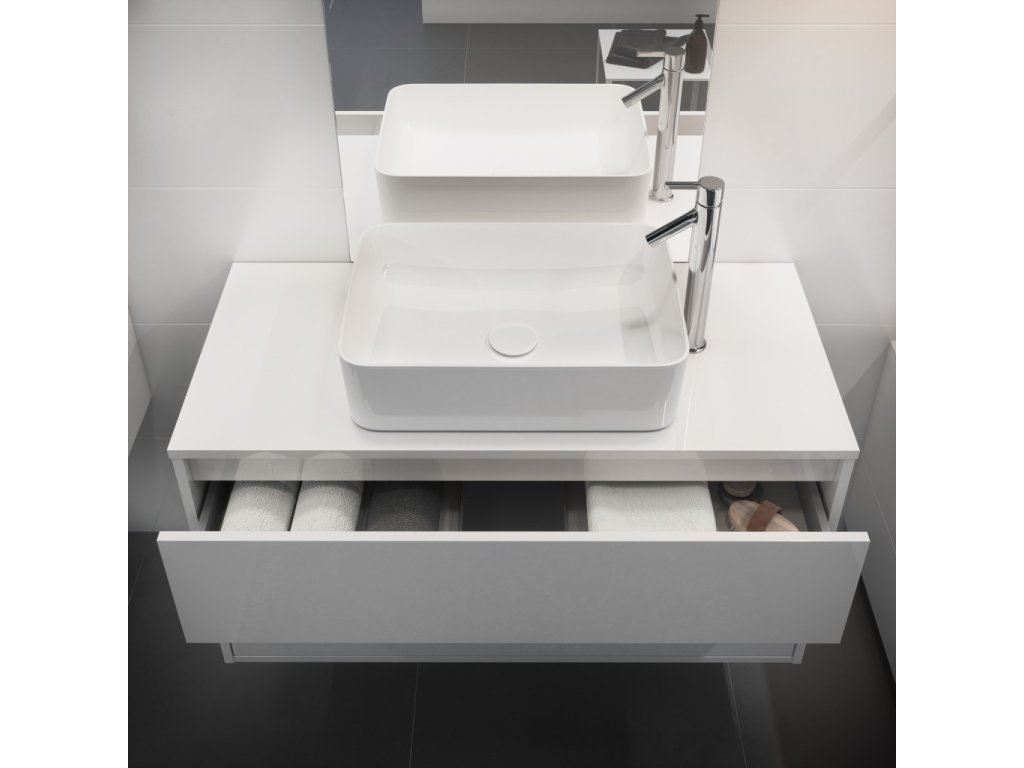 Závěsná skříňka CREA 100 pod umyvadlo na desku se dvěma výsuvnými boxy v bílém provedení, vyrobená moderní technologií AQUASAFE /zvýšená odolnost proti vlhkosti/. Skříňka působí elegantním vzhledem díky zapuštění přední části a využití skrytých madel. Zásuvky jsou vybavené pojezdy "HAFELE" s plným výsuvem a tichým uzavíracím systémem, který zvyšuje komfort používání.