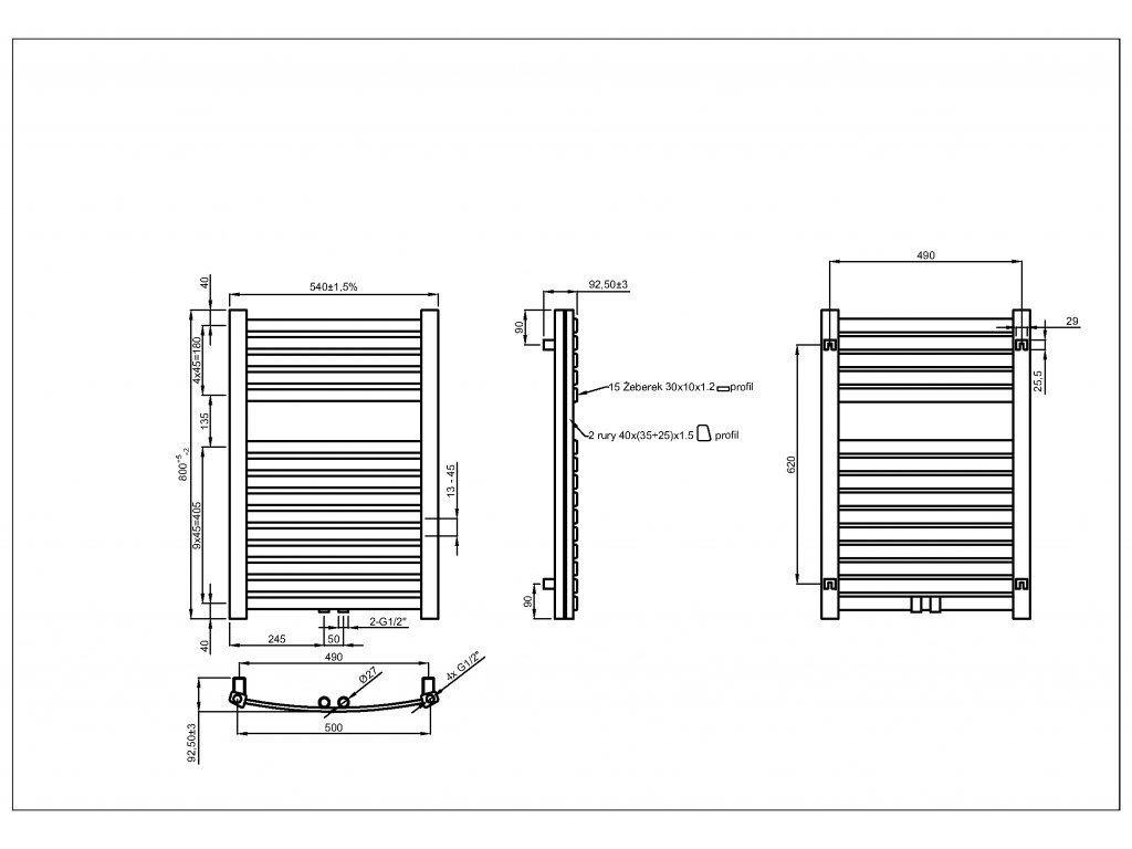 - univerzální a nejběžnější varianty připojení každého modelu radiátoru: spodní střední d50 - 50 mm, spodní axiální 500 mm, vnitřní závity ½ "