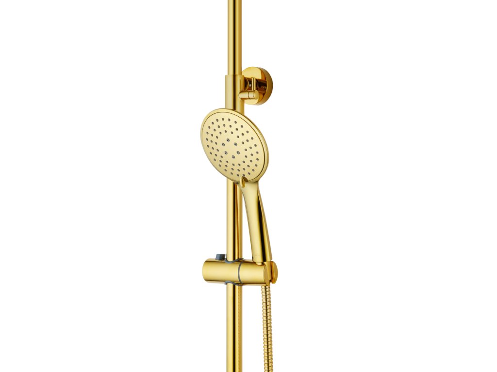 Rozměry balení kolektiv (výška/šířka/hloubka)[m] : 1,06x0,35x0,37 Množství v balení kolektiv : 4 KS. Hmotnost balení kolektiv : 18,1 kg Zlatá dešťová sprcha doplněná termostatickou baterií je módním a funkčním řešením pro sprchový kout. Zlatá bude dokonale ladit s uspořádáním koupelny zařízené v glamour, boho nebo dokonce loftovém stylu. Jeho výška je nastavitelná od 103 do 156 cm, což nám umožňuje zvolit si velikost individuálně podle našich potřeb. Dešťová sprcha je vybavena termostatickou baterií s hlavicí francouzské značky Vernet, která jí dává životnost 40 000 cyklů. Možnost uzamknout teplotu na 38°C z něj dělá bezpečné řešení i pro nejmladší uživatele. Dešťová sprcha a sprchová hlavice, vybavené systémem proti vodnímu kameni, usnadňují udržování všeho čistého. 3 druhy proudu dostupné ve sluchátku usnadní každodenní péči a příjemný „déšť“ usnadní.Doplňkové parametry