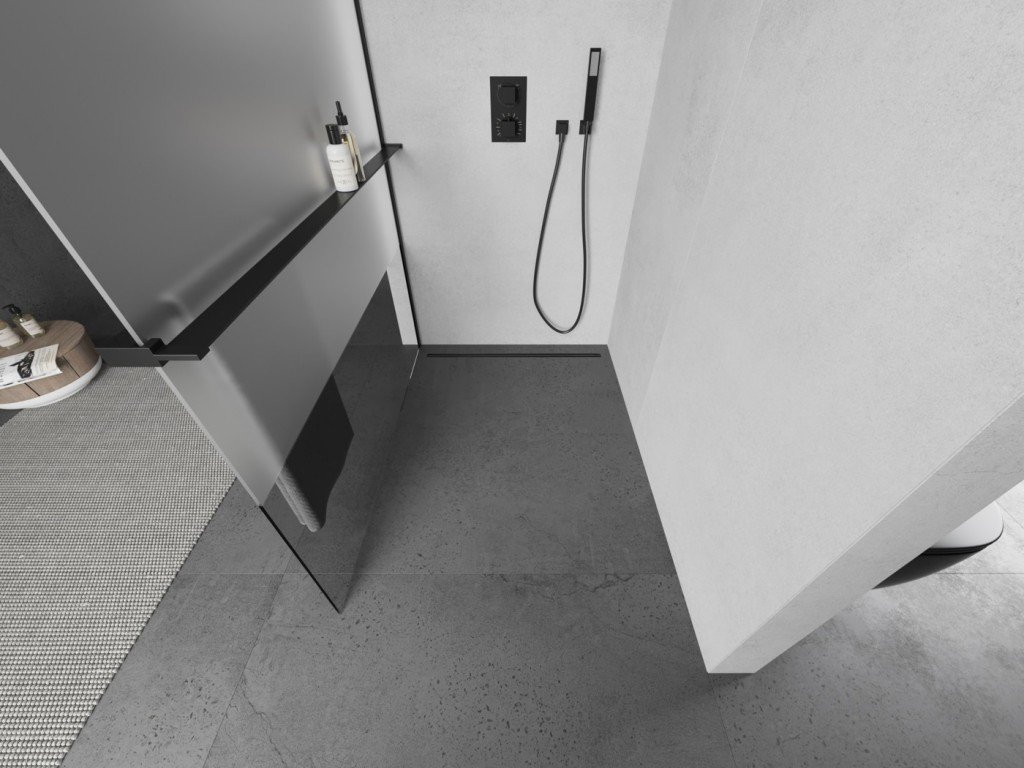 MEXEN/S - Kioto+ L Sprchová zástěna WALK-IN s poličkou a držákem ručníků 80 x 200, transparent/dekor, černá - 800-080-123-70-30 800-080-123-70-35