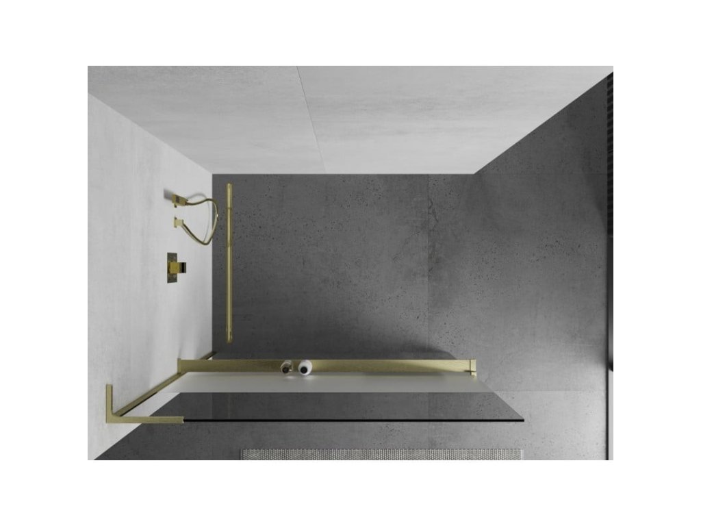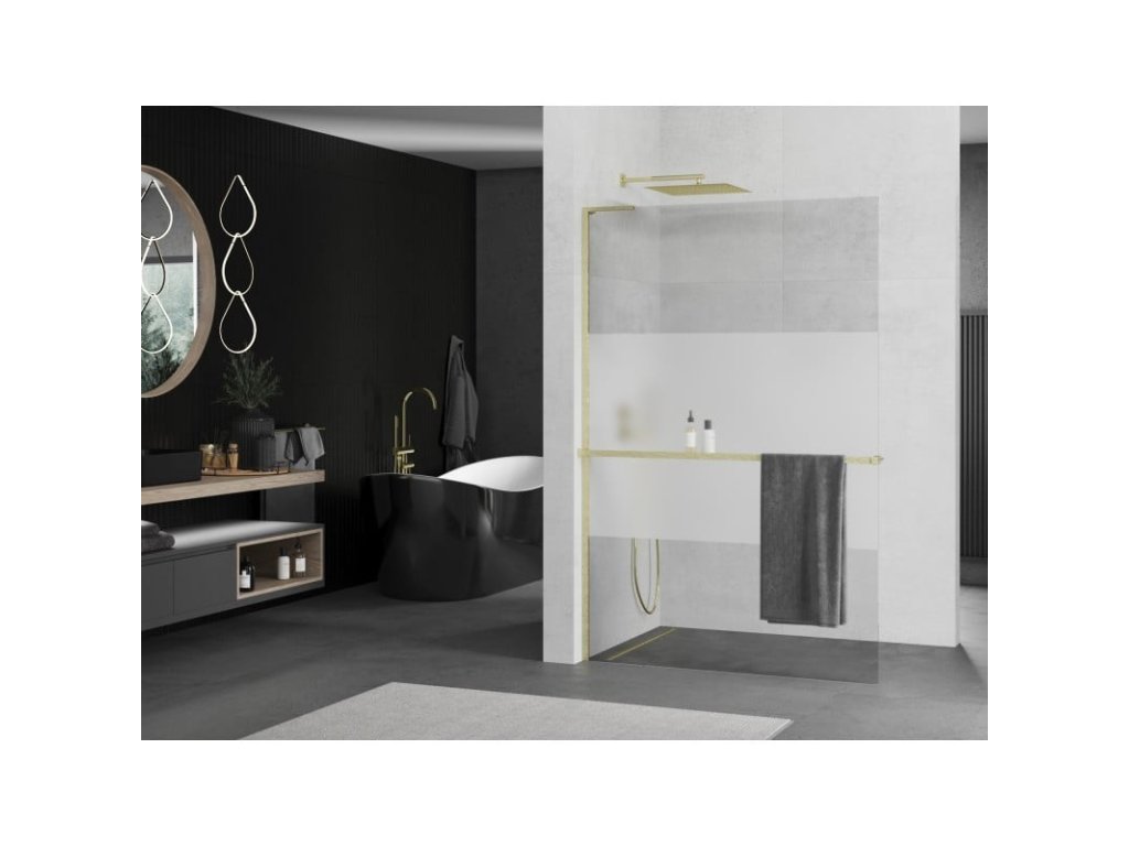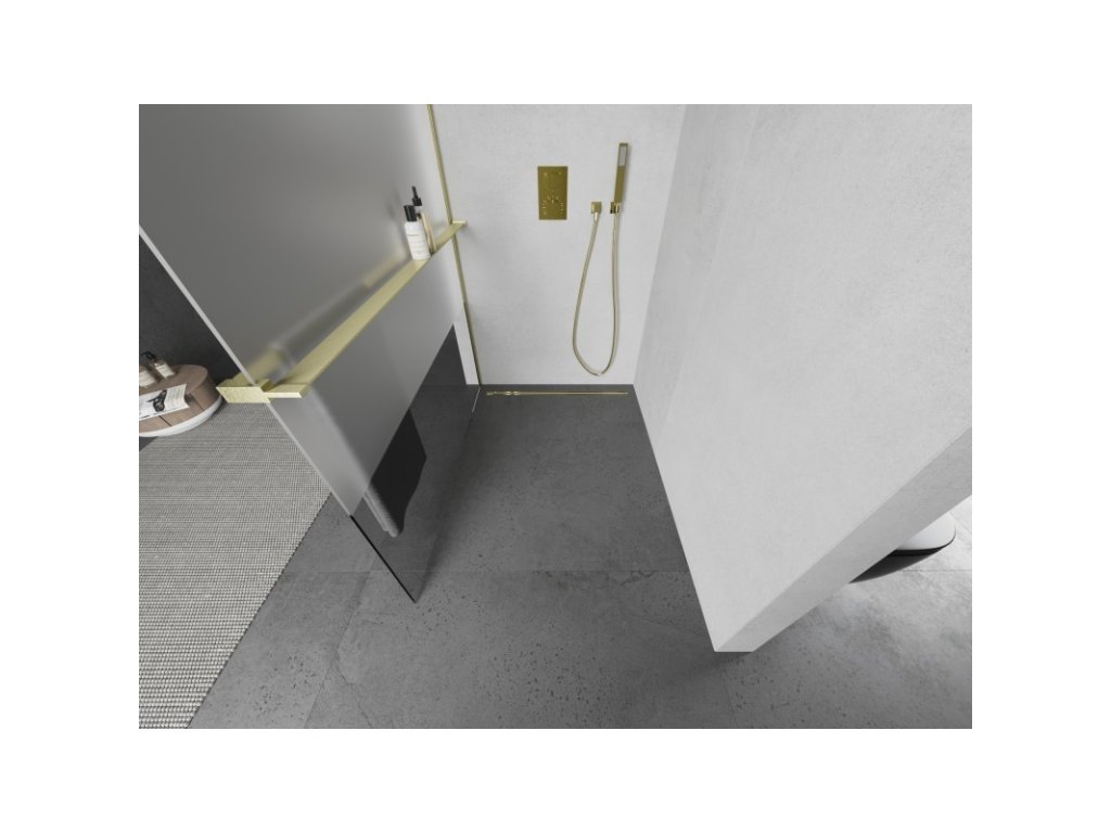 MEXEN/S - Kioto+ L Sprchová zástěna WALK-IN s poličkou a držákem ručníků 80 x 200, transparent/dekor, zlatá kartáčovaná 800-080-123-55-35