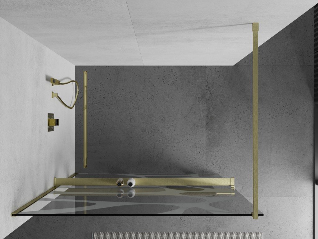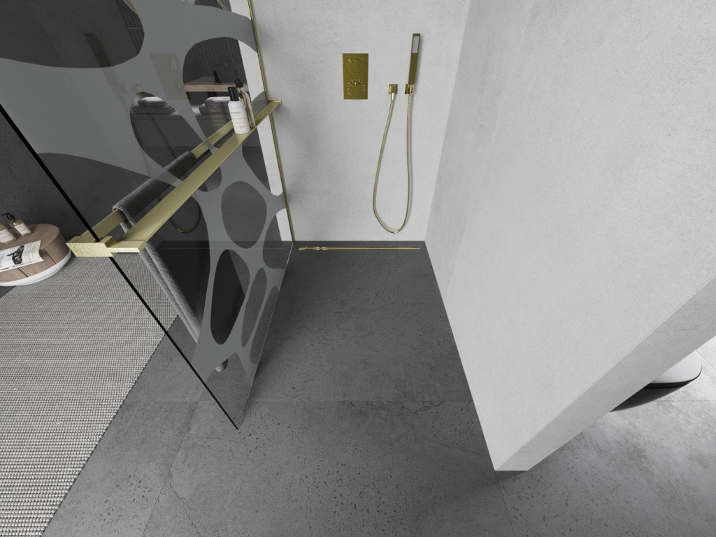 MEXEN/S - Kioto+ Sprchová zástěna WALK-IN s poličkou a držákem ručníků 70 x 200, bílý vzor, zlatá kartáčovaná 800-070-121-55-97