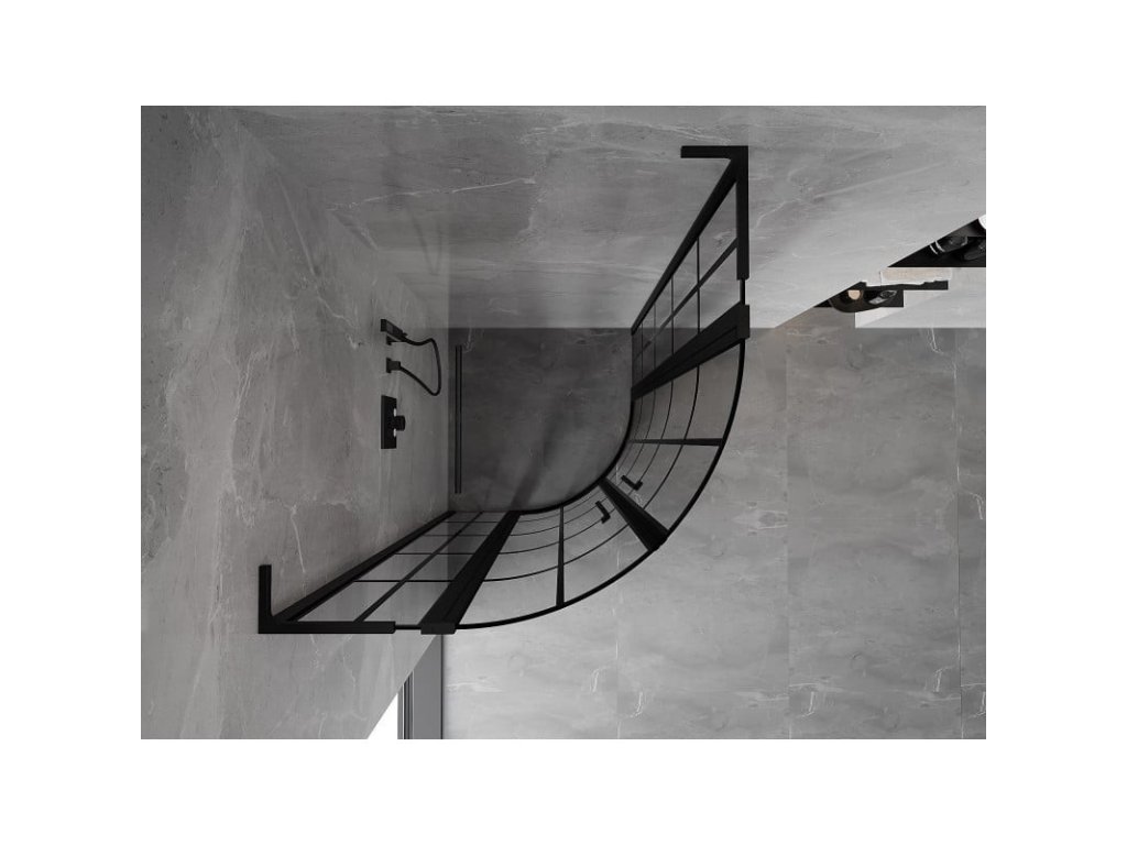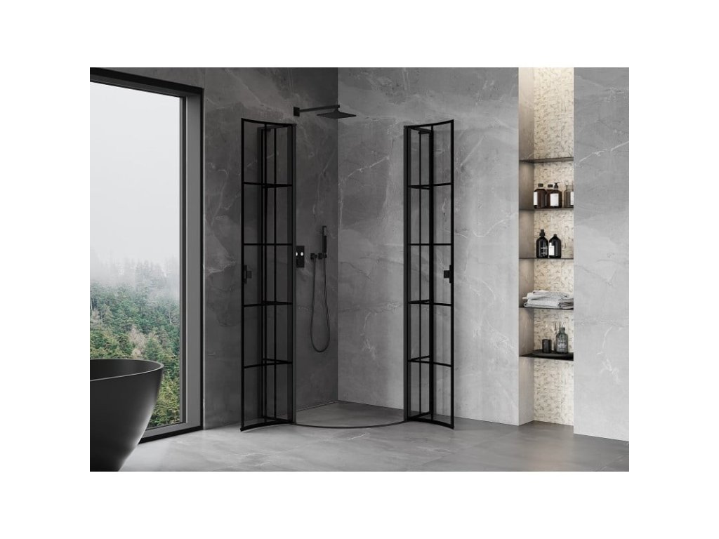 Specifikace produktu: Rozměr: 90x90 cm Výška: 200 cm Poloměr zakřivení R55 Strana montáže: Univerzální Vchod: Dveře s výklopnými křídly Barva skla: Černá mřížka Povrchová úprava: Černá Profil: Hliník Úhlový stabilizátor L: Nerezová ocel Typ skla: Tvrzené Tloušťka skla: 6 mm Povrchová úprava pro snadné čištění Nastavitelná šířka Možnost instalace na sprchovou vaničku nebo dlaždice Mechanismus pro zvedání a spouštění dveří Magnetický proužek a elastomerové těsnění pro odtok vody Hliníkový práh těsnění dveříDoplňkové parametry