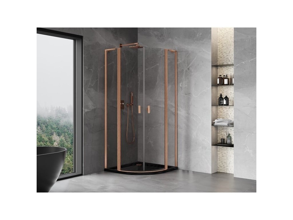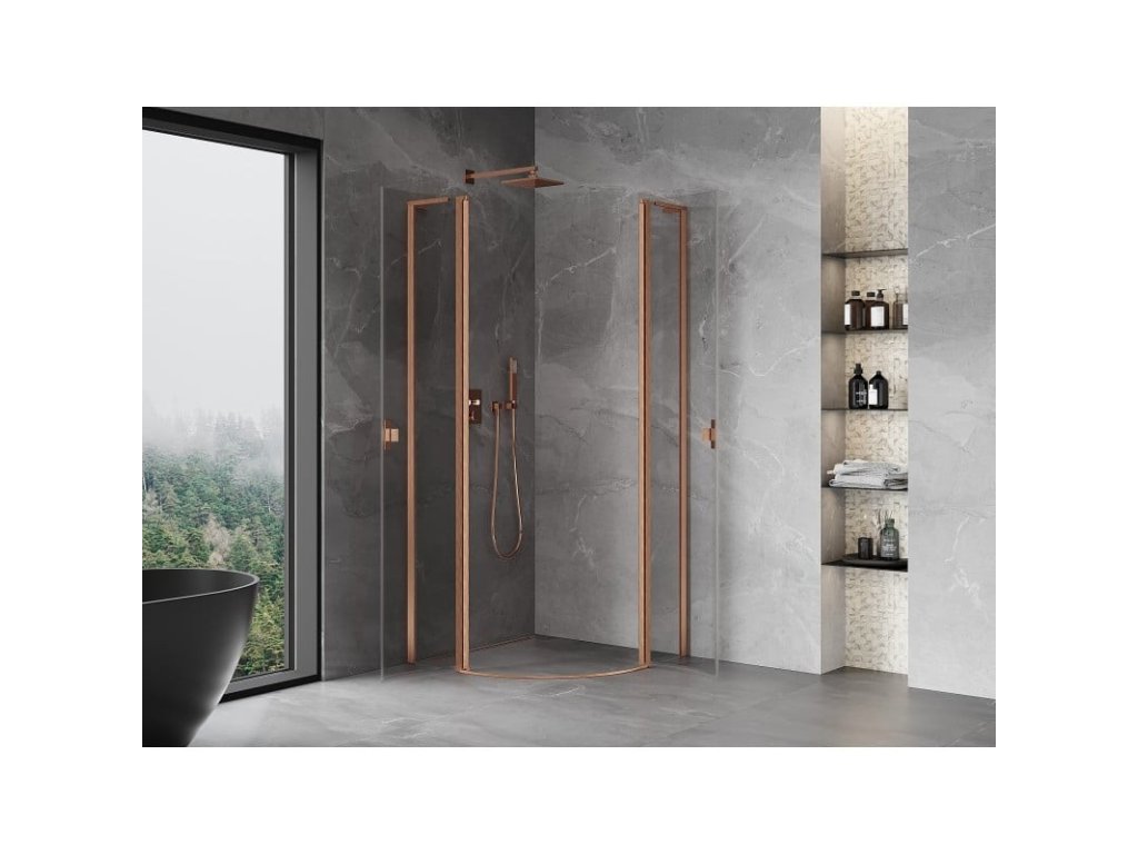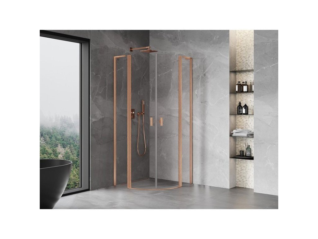 Specifikace produktu: Rozměr: 90x90 cm Výška: 200 cm Poloměr zakřivení R55 Strana montáže: Univerzální Vchod: Dveře s otočnými křídly Barva skla: Průhledná Povrchová úprava: Kartáčovaná měď Profil: Hliník Stabilizátor ve tvaru L: Nerezová ocel Typ skla: Tvrzené Tloušťka skla: 6 mm Povrchová úprava pro snadné čištění Nastavitelná šířka Možnost instalace na sprchovou vaničku nebo dlaždice Mechanismus pro zvedání a spouštění dveří Magnetický proužek a elastomerové těsnění pro odtok vody Hliníkový práh těsnění dveříDoplňkové parametry
