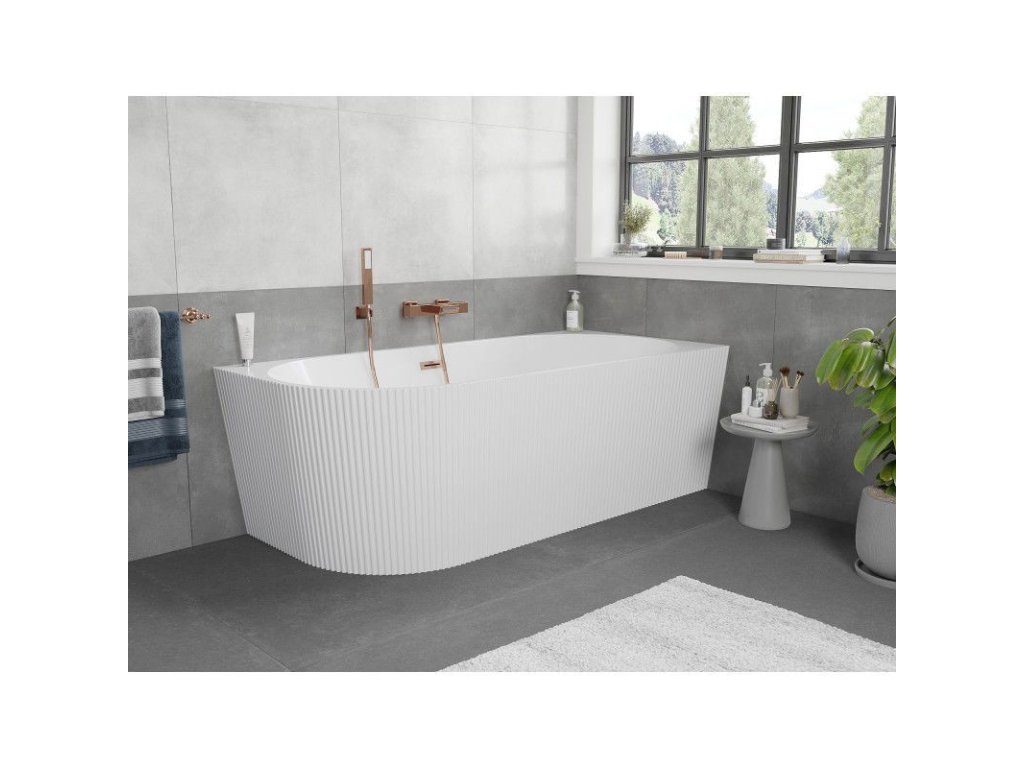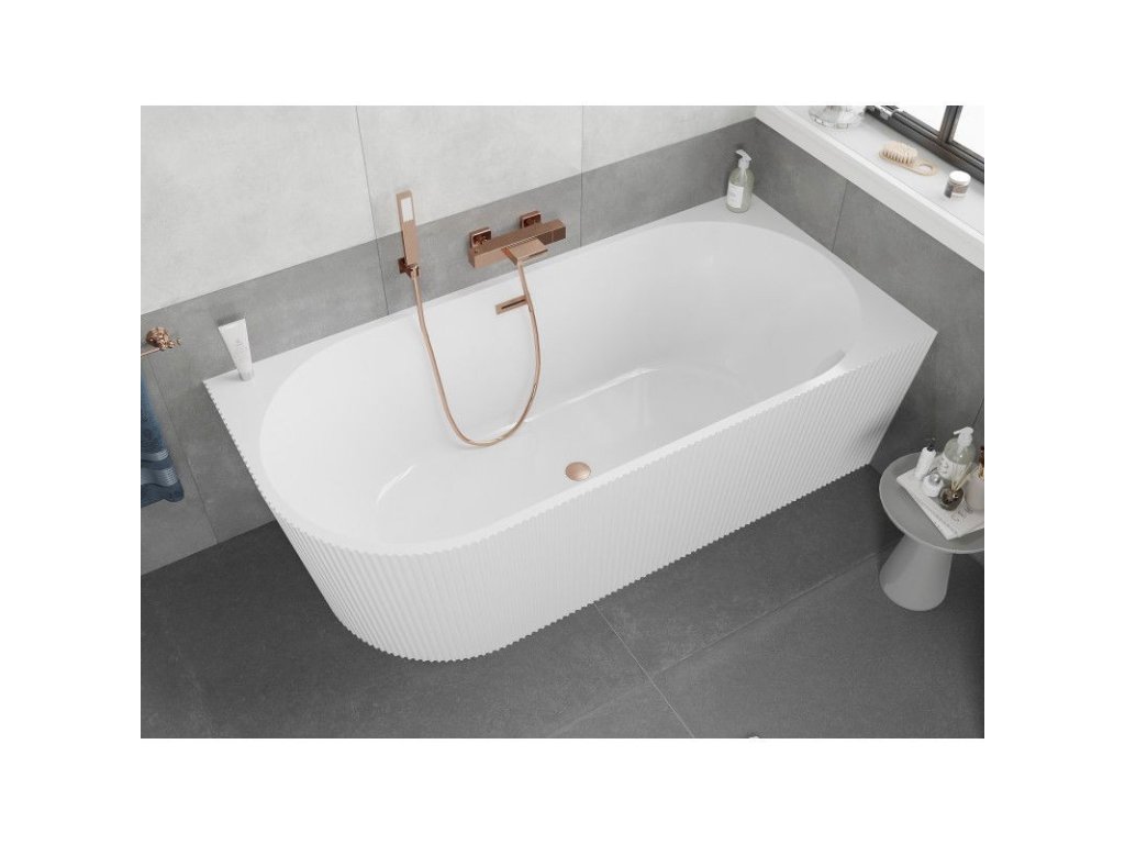 Specifikace produktu: Rozměr: 170 x 80 cm Výška: 58 cm Hloubka: 42,5 cm Montáž: Rohová, Levá Materiál: Sanitární akrylát Barva: Bílá Povrchová úprava: Kartáčovaná měď Konstrukce: Drážkovaná Otvor pro přepad: Ano Otvor pro baterii: Ne Sifon a zátka click-clack jsou součástí dodávky Odolné vůči baterii, baterii a UV zářeníDoplňkové parametry