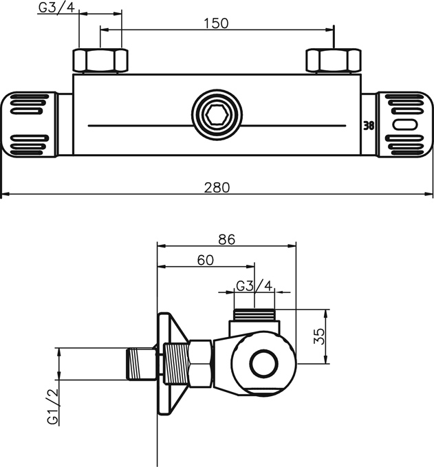 Odolná termostatická kartuše <b>s prodlouženou zárukou 7 let</b>. Prvotřídní chromové provedení. Sprchová termostatická baterie s roztečí 150 mm s horním vývodem vody 3/4" a redukcí na 1/2".