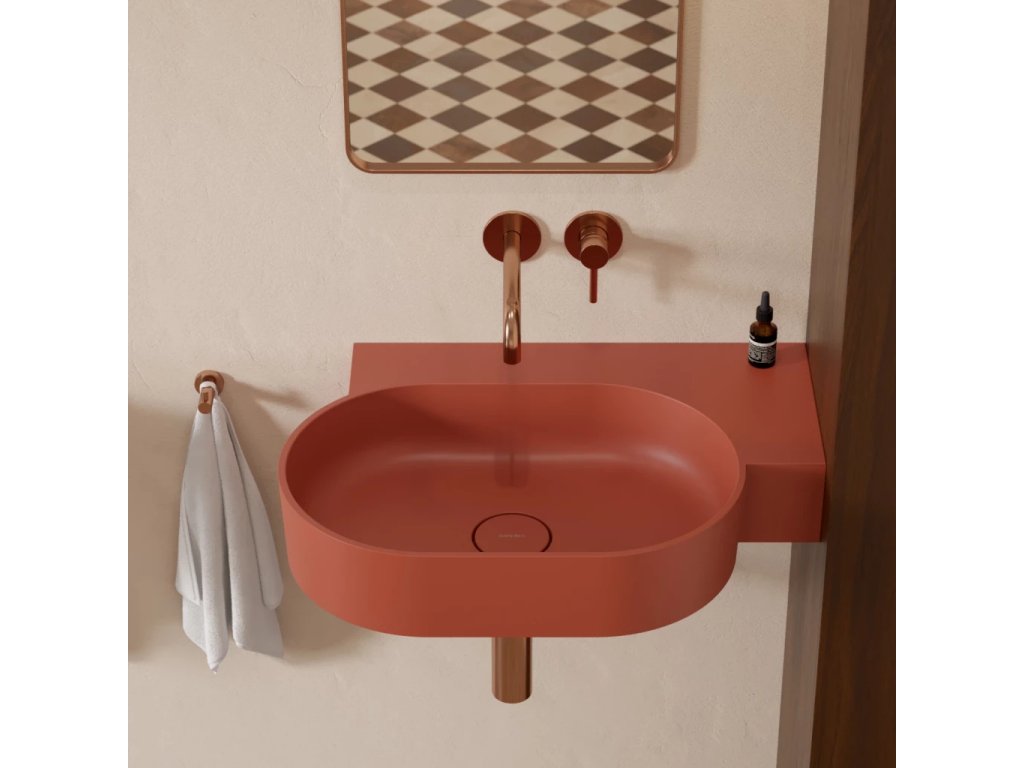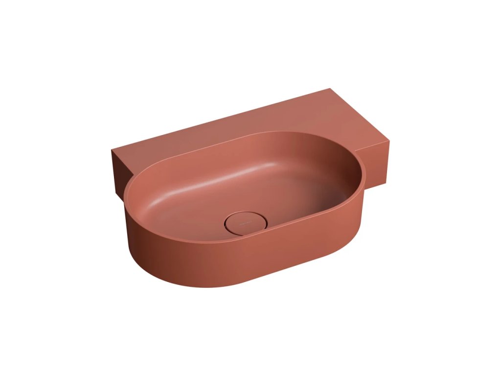 OVO v terakotové barvě (RAL8004) je umyvadlo v sofistikované cihlově červené barvě se sametově hebkým matným povrchem.