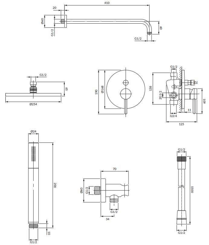 - mosazné sprchové rameno, dosah od stěny: 41 cm