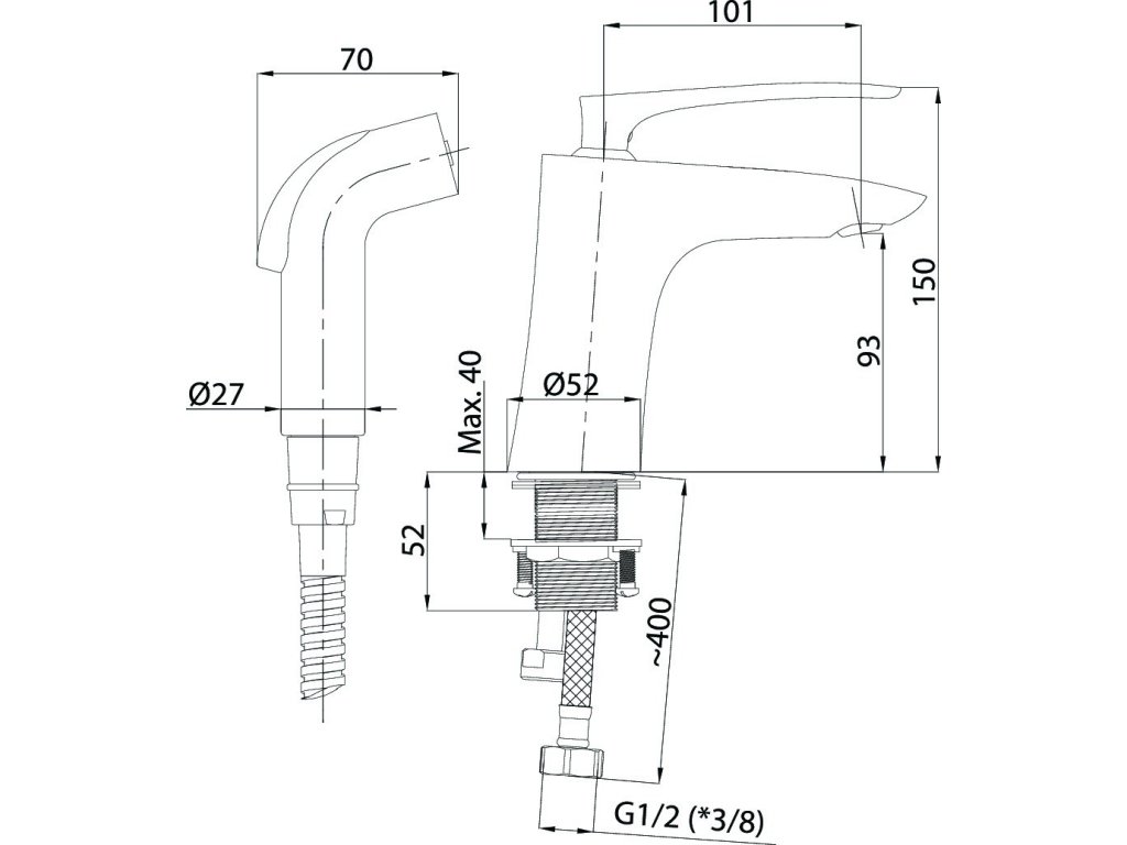 Součástí baterie je bidetová sprcha, hadice a držák sprchy.